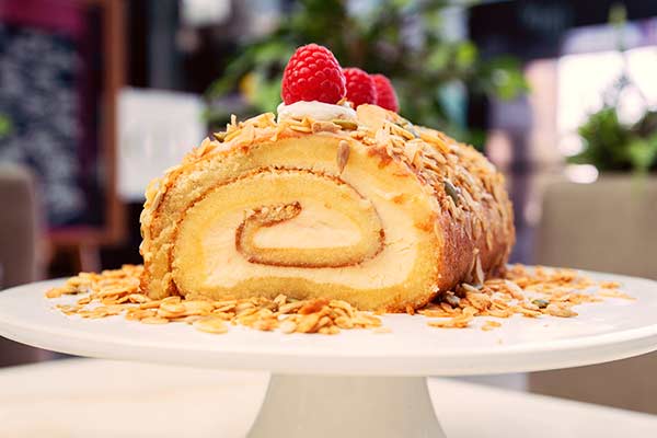 Eier, Zucker und Vanillemark mindestens 5min cremig aufschlagen, restliche Zutaten unterheben. Auf einem Backblech ausstreichen, bei 170°C etwa 13min backen, sofort auf ein Stück Backpapier stürzen, auskühlen lassen. Sahne steif schlagen, mit den übrigen Zutaten mischen, kalt stellen. Backpapier vom Biskuit abziehen, mit Creme bestreichen, aufrollen, mindestens 3 Stunden im Kühlschrank aufbewahren. Zum Servieren mit Kakaopulver bestreuen.